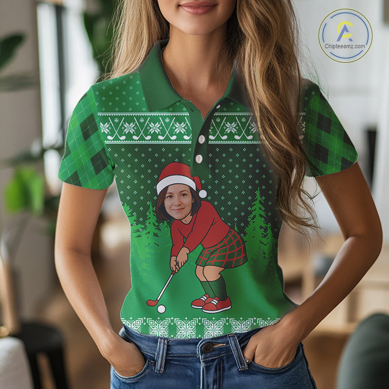 Personalized Funny Face Christmas Golf Green argyle Santa Golfer Ugly matching golf polos for couples NQS11021
