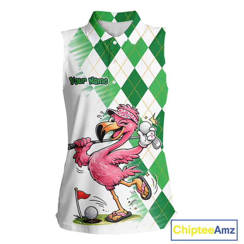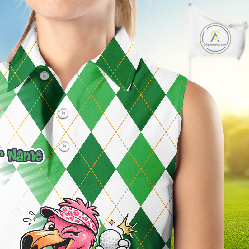 Funny Pink Flamingo Argyle Green Pattern Sleeveless Womens Golf Polo Shirt Custom Golf Shirts For Womens NHT651