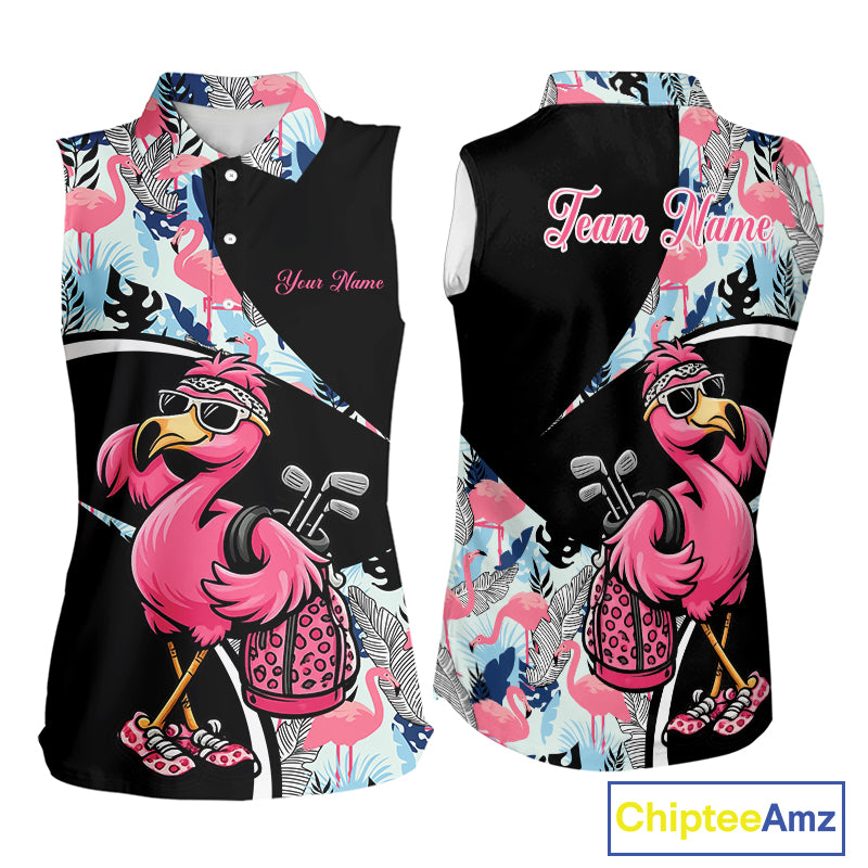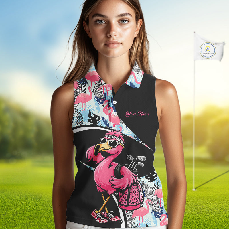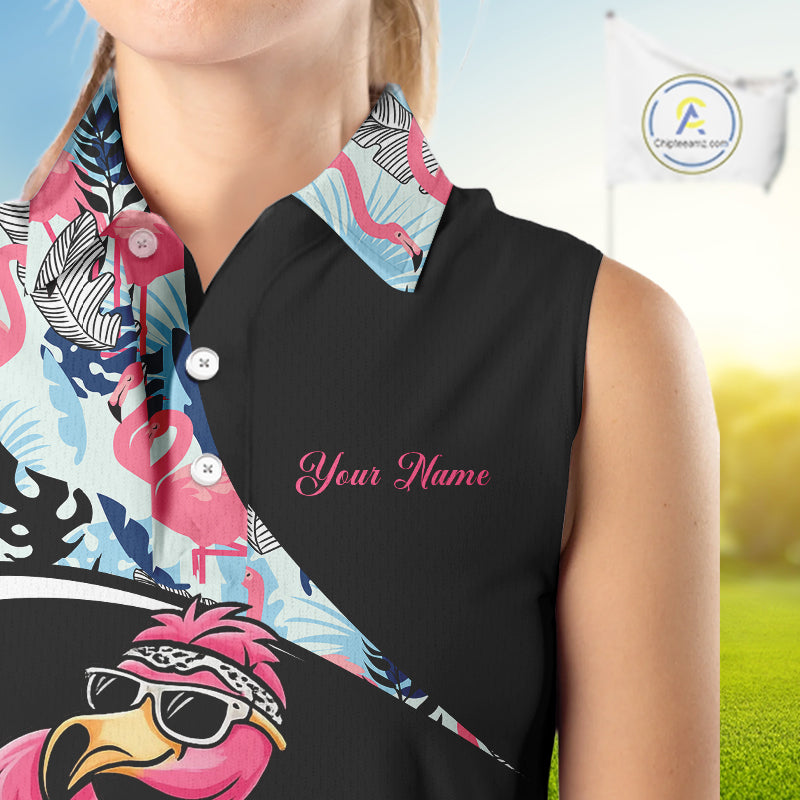 Funny Pink Flamingo Pattern Tropical Flamingo Sleeveless Womens Golf Polo Shirt, Custom Flamingo Golf Shirt For Team NHT653
