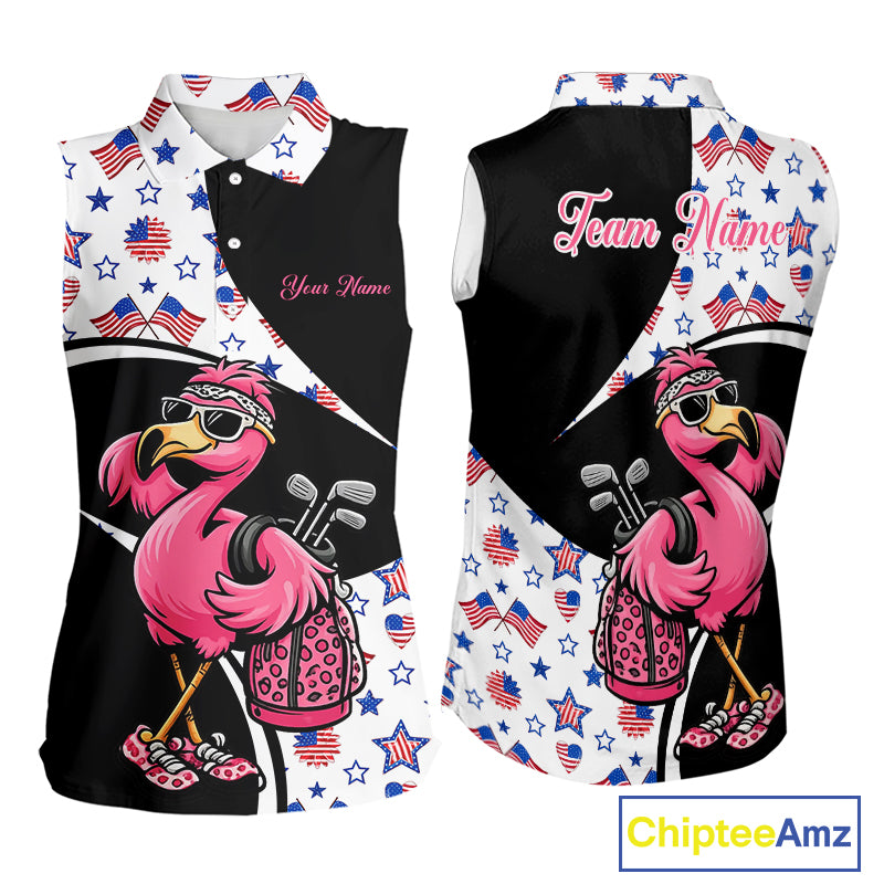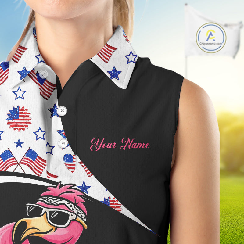 Funny Pink Flamingo Pattern American Flag Sleeveless Womens Golf Polo Shirt, Custom Flamingo Golf Shirt For Team NHT655