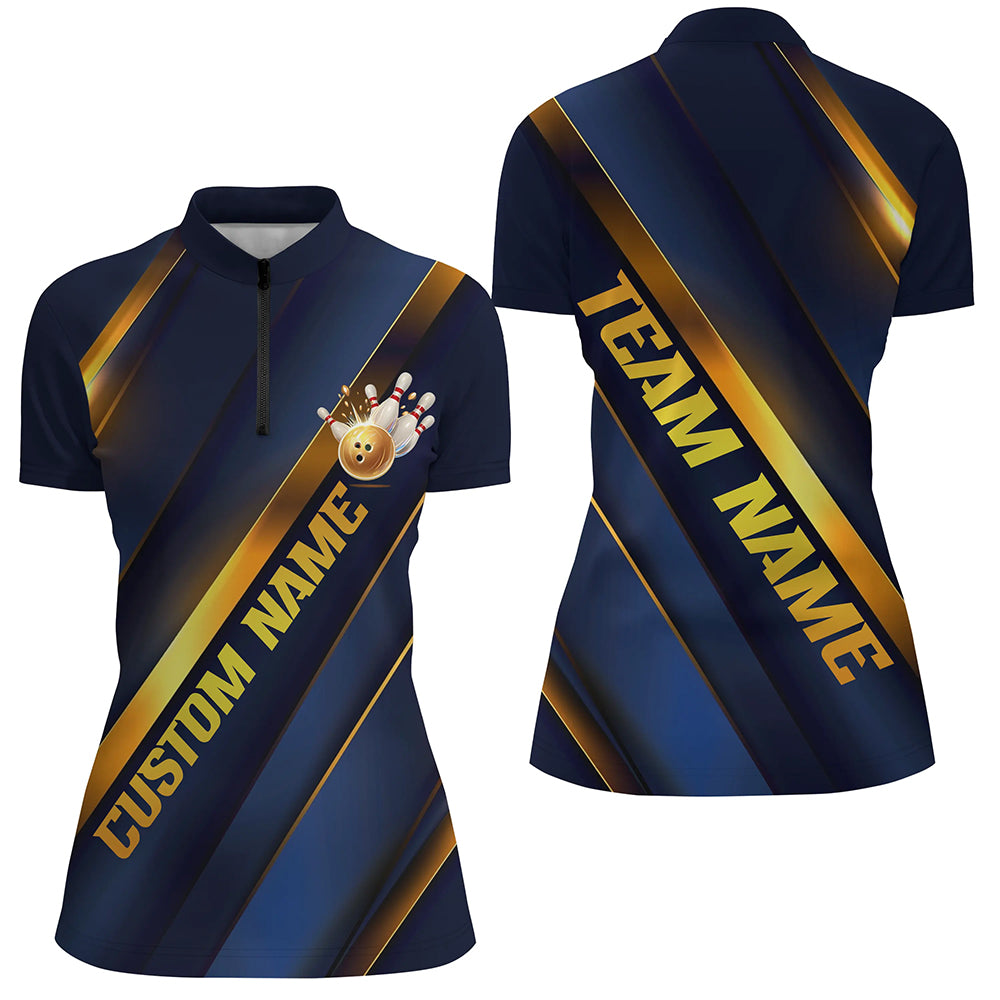 Custom Blue And Gold Bowling Tournament Shirts For Women With Team Name And Bowlers Name IPHW6617