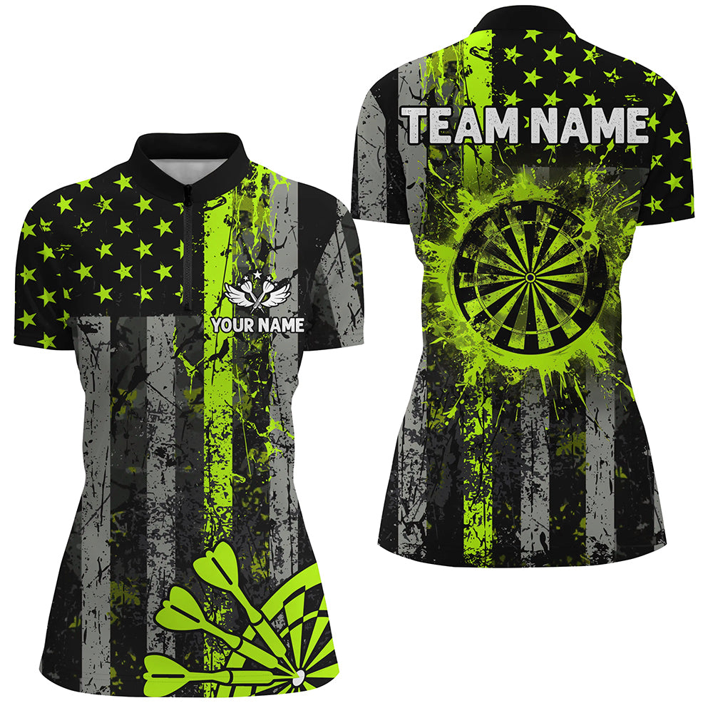 Custom Green Neon Grunge US Flag Patriotic Dart Shirt For Women, Retro Darts Board Darts Team Jersey TDM2576