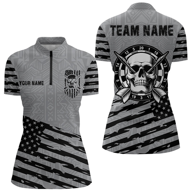 Personalized Grey US Flag Skull Dart Shirts For Women Custom Patriotic Cool Dart Team Jerseys TDM3274