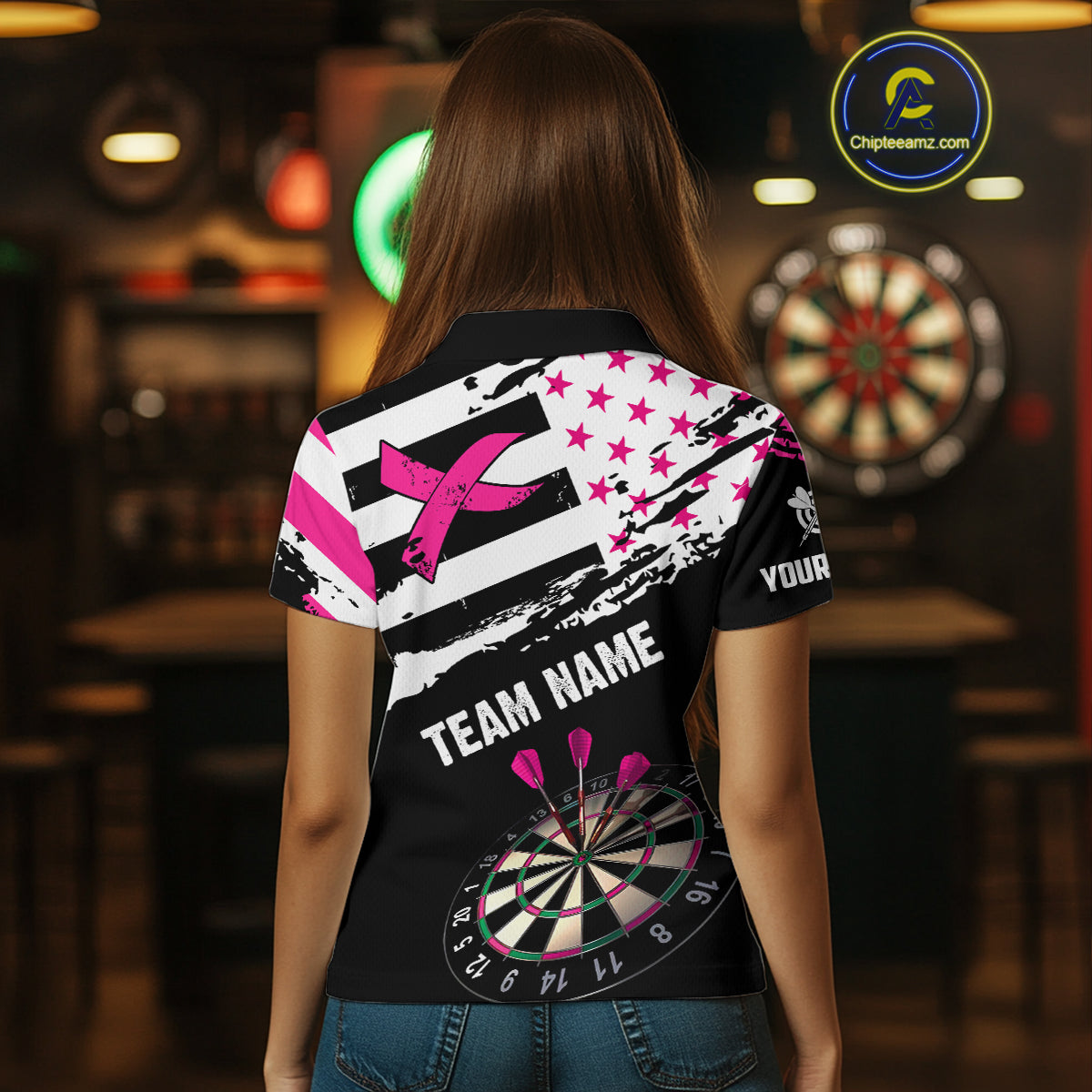 Personalized US Flag Pink Ribbon Darts Shirt For Women Custom Breast Cancer Awareness Darts Jersey TDM4493