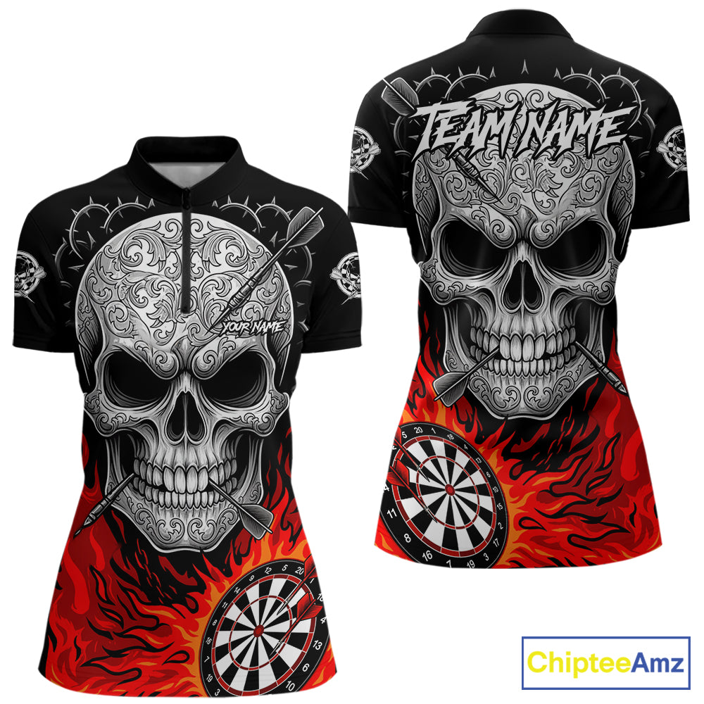 Black And Red Flaming Skull Darts Shirt For Women Custom Darts League Jersey Team Polo & 1/4 Zip TDM5435