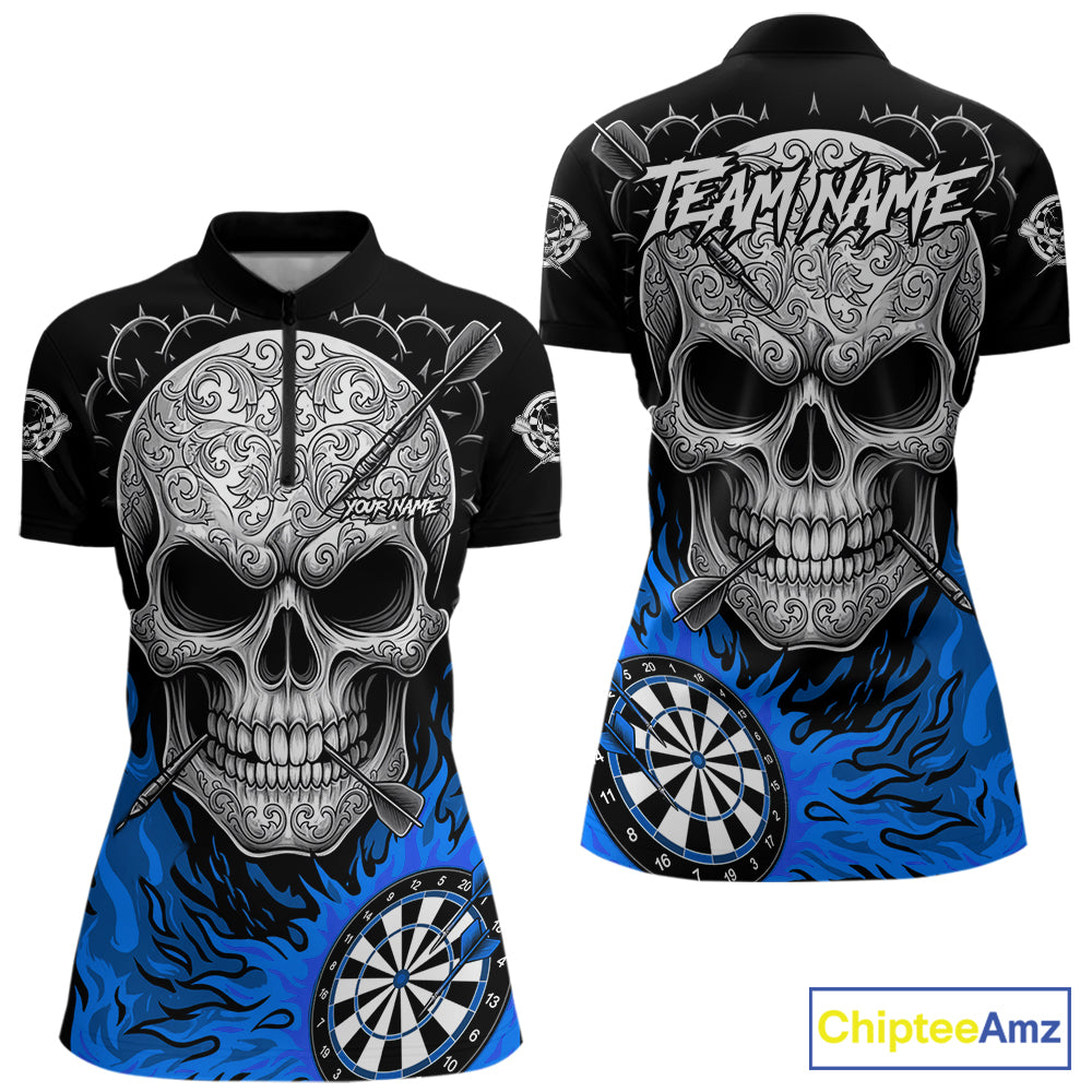 Black And Blue Flaming Skull Darts Shirt For Women Custom Darts League Jersey Team Polo & 1/4 Zip TDM5436